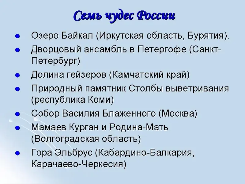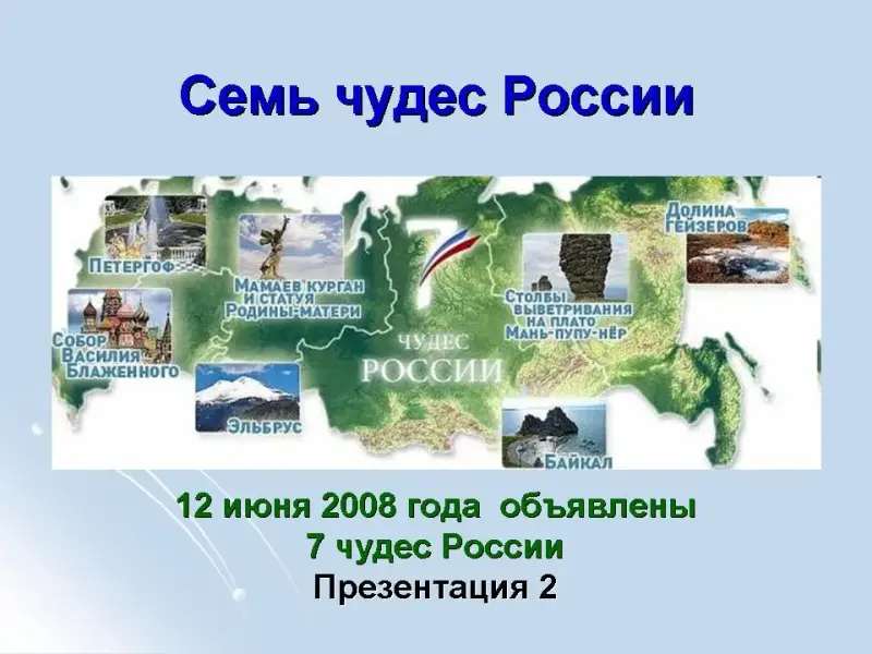 Выборы семи "чудес России" происходили через SMS и интернет голосование. В нем приняли участие около 26 миллионов человек. 12 июня 2008 года в День независимости России на Красной площади были объявлены победители конкурса. Ими стали…