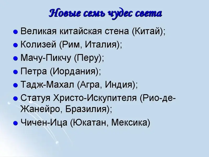 Презентация 2 (слайд 3). Время и история не стоят на месте. Природа и люди создали новые уникальные памятники - новые чудеса. Летом 2007 года в Европе были подведены итоги конкурса "Семь новых чудес света". Ими стали: