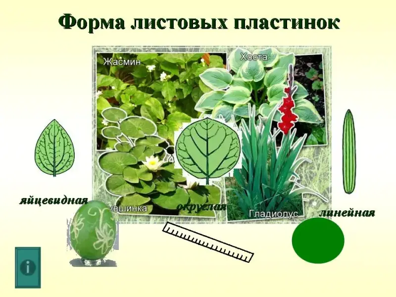 Листья разных растений отличаются друг от друга и по форме листовых пластинок. Форма листа кувшинки называется округлой, а у гладиолуса - линейной, форма листьев жасмина - яйцевидная. Существует огромное количество форм листовых пластинок: округлые, яйцевидные, линейные, ланцетные, копьевидные, стреловидные, сердцевидные, продолговатые и др.