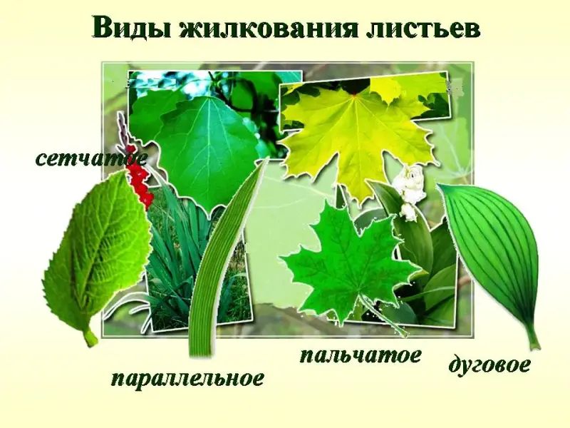 Если посмотреть на листовую пластинку, можно заметить жилки - пучки проводящих сосудов. Расположение жилок на листе может быть разным. Способ расположения жилок называют жилкованием листа. Выделяют несколько типов жилкования: параллельное, дуговое, сетчатое, пальчатое. Например, лист осины украшает тончайшая сеточка из жилок. Такое жилкование называется сетчатым. В листе клена крупные жилки расходятся из одной точки у черешка. Это пальчатое жилкование. У длинного заостренного листа гладиолуса все крупные жилки расположены параллельно друг другу. Такое жилкование называется параллельным. В листе подорожника все жилки, кроме центральной, изогнуты как дуги. И жилкование называется дуговым. Параллельное или дуговое жилкование характерно для однодольных растений, а сетчатое - для двудольных.