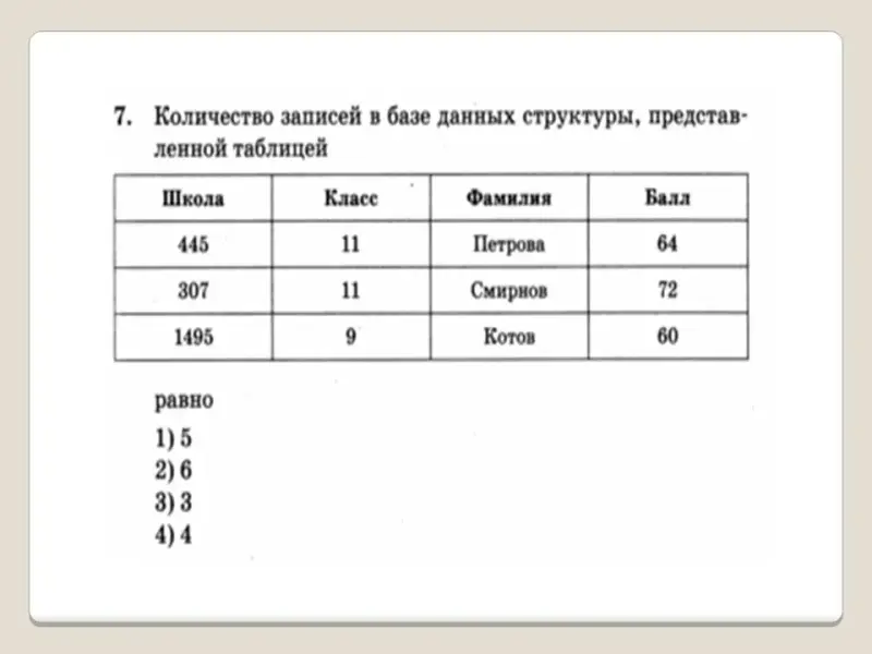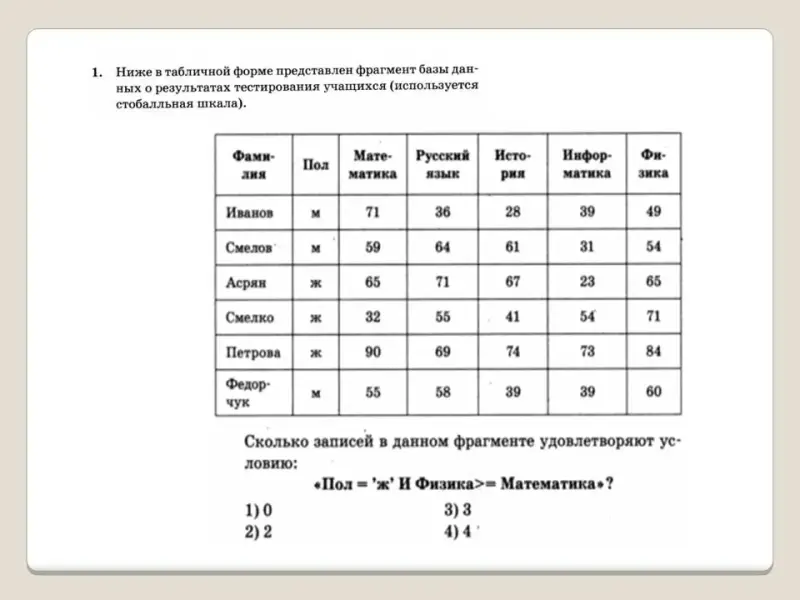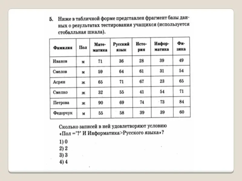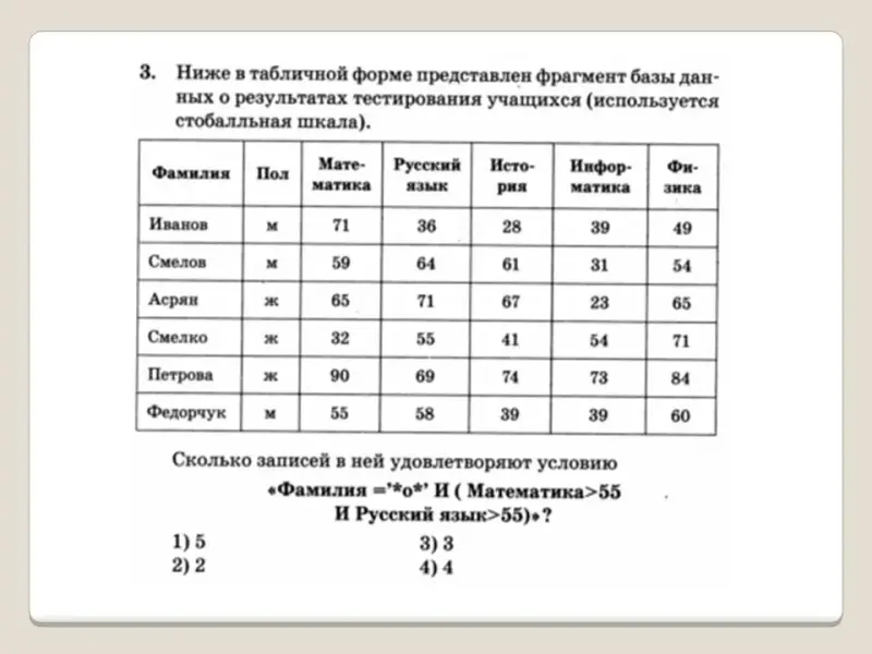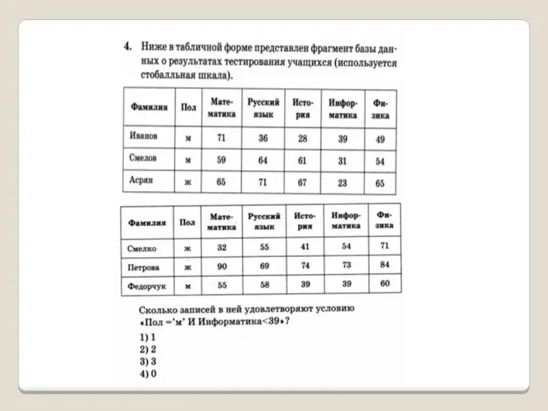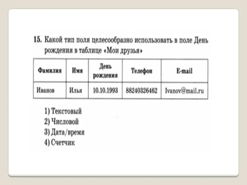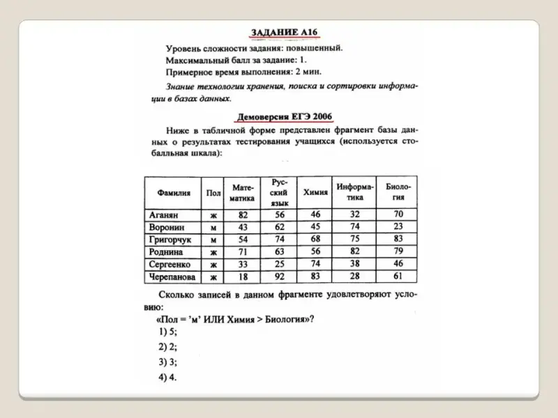 И последний тип заданий и разбор решения, которые встречаются в ЕГЭ по теме БД: (слайд № 25-26).