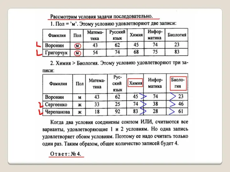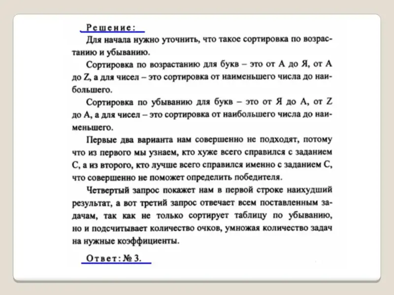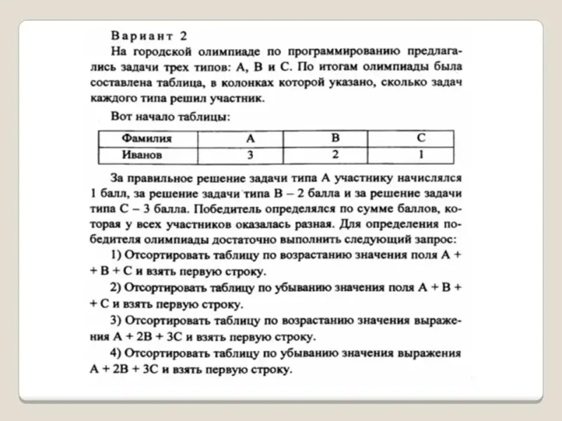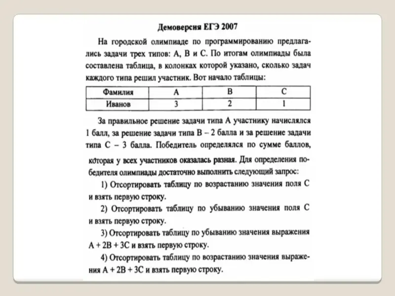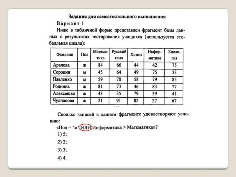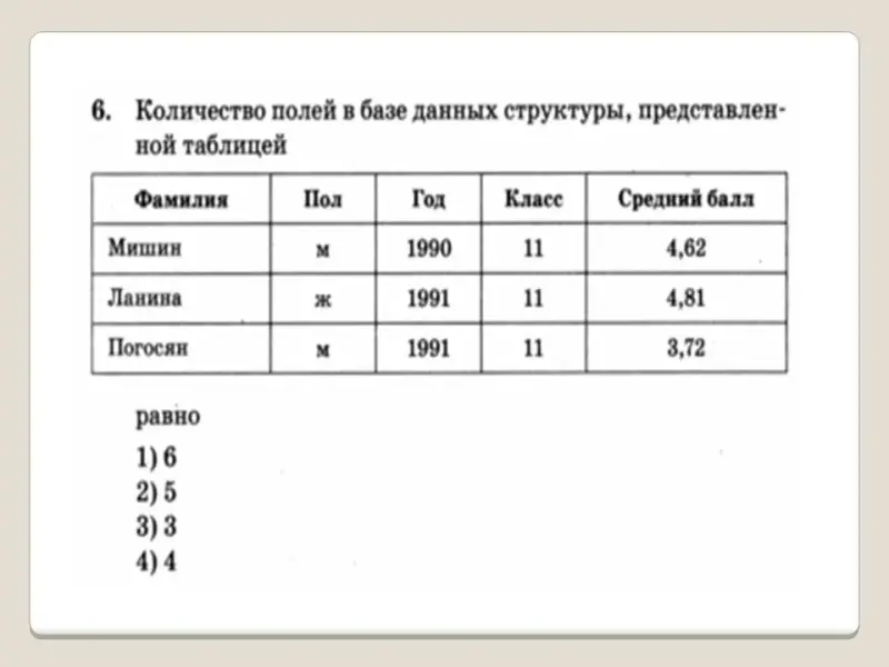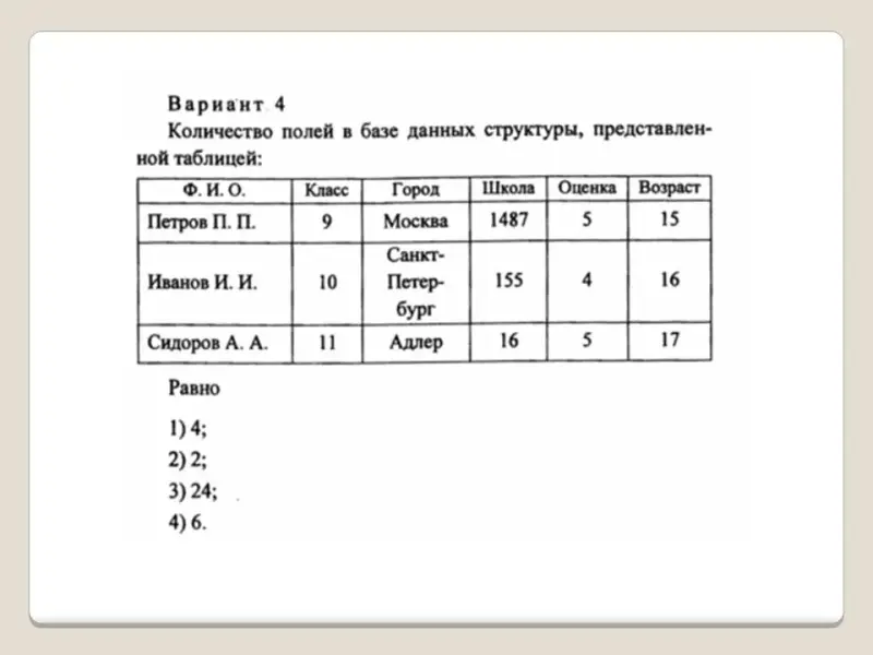 И последний тип заданий и разбор решения, которые встречаются в ЕГЭ по теме БД: (слайд № 25-26).