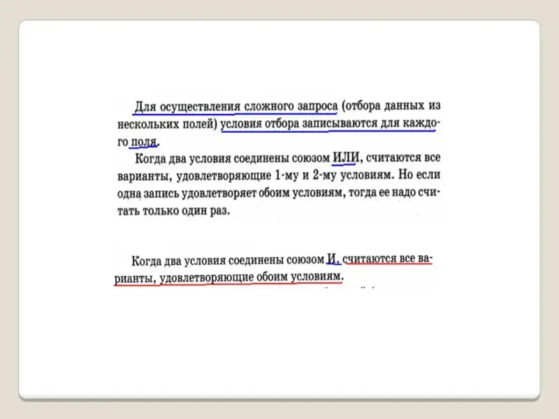А теперь следующий этап: при создании запроса нам необходимо будет составить сложное условие. Рассмотрим примеры записи условий отбора данных (слайд №13-14).
