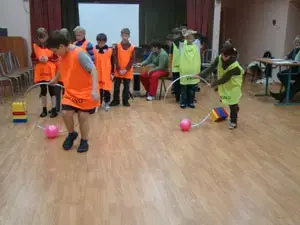 - Эстафета "стрельба из лука". (Попасть в ведро луком).