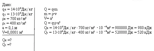 2) Даны кубики одинакового размера из сосны и березы. Нужно определить количество теплоты, которое выделится при полном сгорании этих видов топлива.