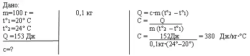 Ответ: 380 Дж/кг·°С, по таблице находим, что это латунь.