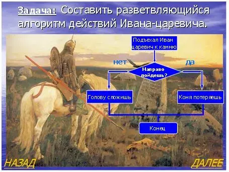 Демонстрируется слайд 11 « Витязь на распутье». Каждый раз после того как учащиеся называют очередную команду, на слайде демонстрируется соответствующий элемент блок-схемы.