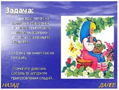 Сначала учитель предлагает одному из учащихся устно проговорить вариант данной задачи. Здесь следует иметь в виду, что возможна ошибка в составлении алгоритма, когда Маша продолжает действия, пока не закончатся яйца в холодильнике.