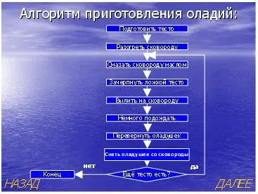Один из учащихся определяет порядок действий по приготовлению оладий. После того как названа очередная команда, на слайдедемонстрируется соответствующий элемент блок-схемы: