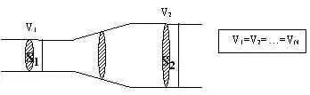 Пусть жидкость течет без трения по трубе переменного сечения <Рисунок 3>. Иначе говоря, через все сечения трубы проходят одинаковые объемы жидкости, иначе жидкости пришлось бы либо разорваться где-нибудь, либо сжаться, что невозможно. За время t через сечение S1 пройдет объем