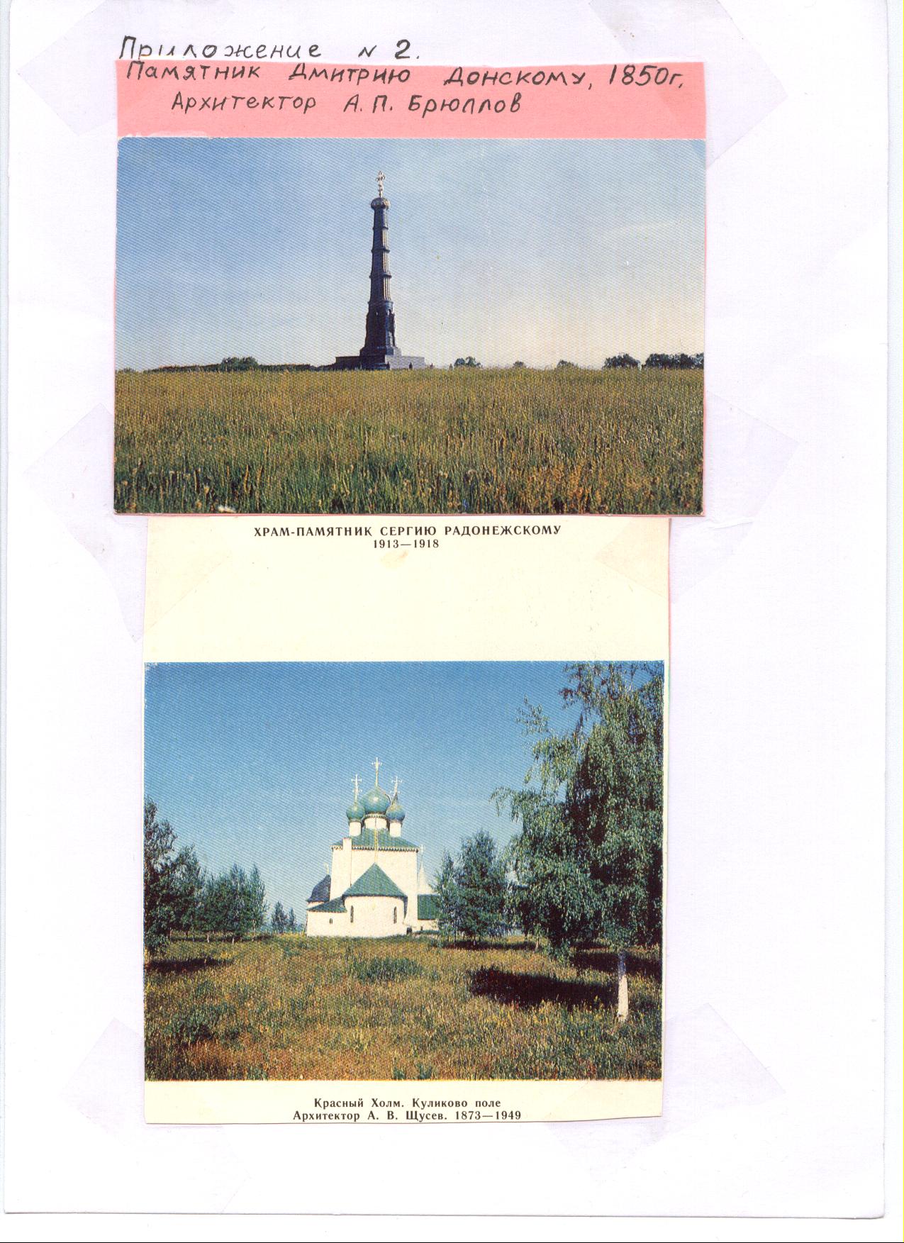 3. Причины победы и историческое значение Куликовской битвы. В чем же значение битвы? Почему русские одержали победу на Куликовом поле? (1. Успешное развитие хозяйства, возможность собрать большое и хорошо вооруженное войско.2. Начавшееся объединение русских княжеств, ослабление Орды.3. Патриотизм русского народа.4. Полководческое искусство Дмитрия и его военачальников. Возросло и укрепилось значение Москвы как центра объединения русских земель.) «Прошло около 500 лет и после Отечественной войны 1812 г. Царское правительство решило наконец увековечить победу в Куликовской битве и разрешило сбор средств на мемориальный комплекс. Составление проекта длилось без малого 25 лет и только в 1847 г. Был принят проект академика А. П. Брюллова. Монумент удачно размещен на вершине невысокого Красного холма, где стоял шатер Мамая. На широком и довольно высоком ступенчатом основании возвышается мощная пятиярусная колонна, увенчанная граненой позолоченной главкой с крестом, попирающим полумесяц. Нижний ярус богато украшен воинскими доспехами и щитами с гербом Московского княжества. Три средних яруса украшены пучками коринфских колонок. Верхний ярус - в виде широкой ленты с орнаментом дубовых листьев. Общая высота колонны - 28 метров. Колонна была по частям отлита в Петербурге на заводе Берда. Зимой 1849 года перевезена на Куликово поле и открыта 8 сентября 1850 года.» «В начале ХХ века было решено поставить еще и церковь по проекту Щусева. Заложен храм был в 1913 году, но 1 Мировая война помешала его завершению. Многое было повреждено в годы Великой Отечественной войны. С 1968 года были проведены работы по реставрации памятника по чертежам Щусева. Храм, общая высота которого 29 метров, увенчан тесно поставленным луковичным пятиглавием. В северной башне расположен придел - часовня, в южной - винтовая лестница на звонницу. Выделяясь среди бескрайних полей, причудливые очертания церкви с высокими башнями о сказочных градах, которые издревле стояли на страже рубежей Отечества.» ( Приложение № 2.) |