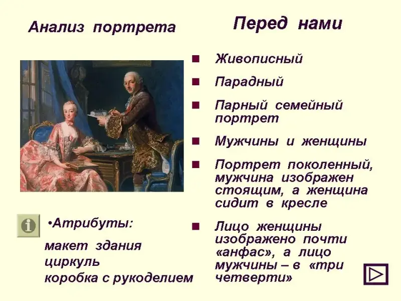 А сейчас мы должны составить план, по которому вы в дальнейшем будете анализировать портрет. Для того, что бы составить план, нужно вспомнить, на какие типы мы можем разделить портреты. слайд 4 и работа со слайдами с 5 по 16 (в представленной презентации даны подробные пояснения к слайдам).