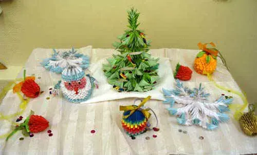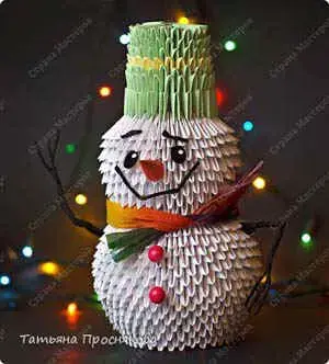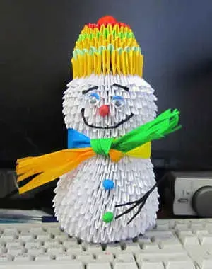 Далее предлагаю выполнить какую-нибудь поделку в этой технике. В этом году это был снеговик. Для него требуется 1122 модуля. Дети сами делают вывод, что делать его лучше всем вместе. Можно подробно разобрать все плюсы и минусы такой работы.