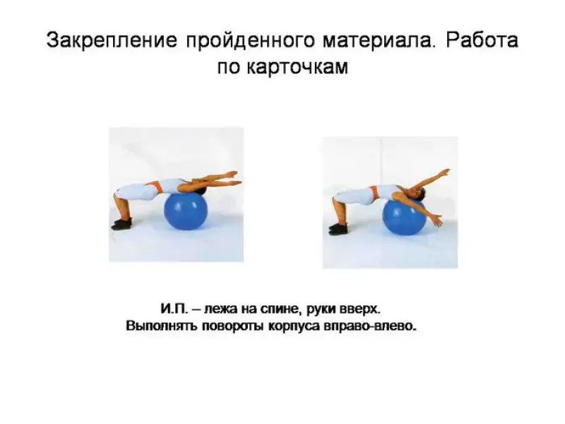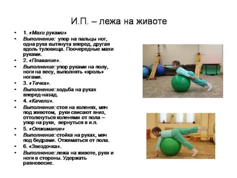 Выполнение: руки положить на мяч; выполнять наклоны вправо-влево, руками коснуться пола.