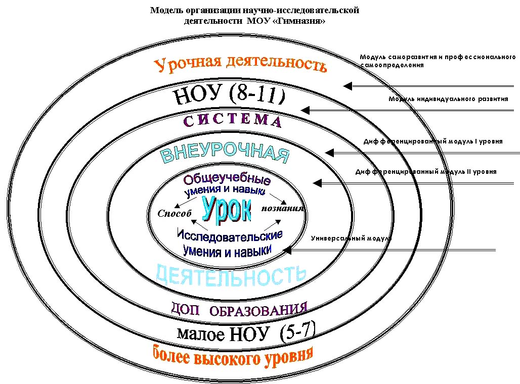 Основополагающим элементом системы, ее базовым ядром является урок. Именно на уроке формируются общеучебные и исследовательские умения и навыки, в совокупности образующие способ познания. Это тот стартовый этап, который предоставляет равные возможности всем учащимся включиться в исследовательскую деятельность, истоки формирования исследовательской готовности учащихся, поэтому урок мы назвали универсальным модулем. Логическим продолжением урочной деятельности является внеклассная работа, под которой мы понимаем деятельность, тесно связанную с изучаемым предметом, но выходящую за рамки базового школьного расписания (творческие и нестандартные уроки, конкурсы, предметные олимпиады, предметные декады, урочно-внеурочная проектная деятельность). Внеурочная деятельность позволяет повысить мотивацию и познавательную активность учащихся, вызвать у них интерес к более глубокому изучению предмета, способствует формированию информационных навыков, коммуникабельности, большей самостоятельности в выборе путей и методов поиска. Внеурочная деятельность образует дифференцированный модуль II уровня, так как в ней участвуют уже не все учащиеся, как на уроке, а наиболее увлеченные предметом. В систему дополнительного образования, образующую дифференцированный модуль I уровня, приходят учащиеся с довольно устоявшимися интересами, мотивированные на достижение практического результата своей деятельности. Данный модуль, в отличие от предыдущего, имеет больше связей и выходов на внешкольную среду. Участие в работе школьных спецкурсов, а также городских и общероссийских интеллектуальных, экологических, общественных конкурсах и проектах, дистанционное образование и телекоммуникационные проекты - все это способствует совершенствованию общеучебных навыков и формированию исследовательской культуры школьников. По характеру траектории развития личности мы отнесли научные общества учащихся (НОУ и малое НОУ), к модулю индивидуального развития, так как, в отличие от двух предыдущих модулей, научно-исследовательская деятельность в рамках НОУ отличается большей научной направленностью, организованностью, требует достаточно развитых исследовательских умений и навыков, и в этом плане успех будет сопутствовать наиболее способным, талантливым детям, имеющим склонности к занятию исследовательской деятельностью. Логическим завершением модели является возврат к уроку, но на новом, более высоком, уровне. В идеале, это такой урок, когда планирование, организация и управление самостоятельной творческой познавательной деятельностью осуществляется на основе абсолютно паритетного сотрудничества всех участников процесса познания. Условно этот уровень можно обозначить как модуль саморазвития и профессионального самоопределения.