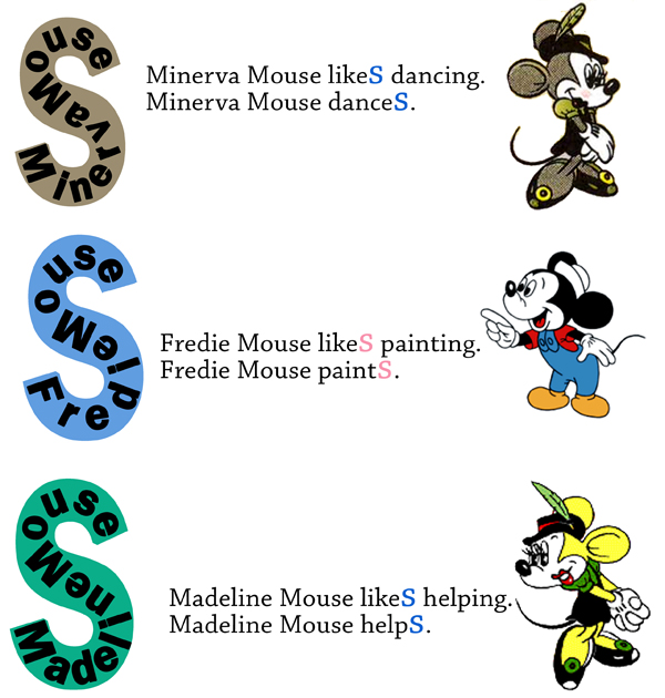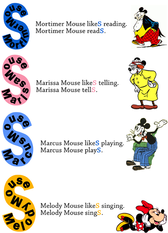 Самая многочисленная семья страны Mouseland - это семья Микки Мауса. Буква 's' для них главная как и для всех жителей этой страны. Любой житель страны мышей легко может вписать свое имя в эту букву. Или заменить имя словами: he, she, it, которые также легко вписываются в букву 's'. Никакие другие слова не могут попасть в эту букву (Приложение 1).