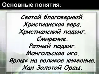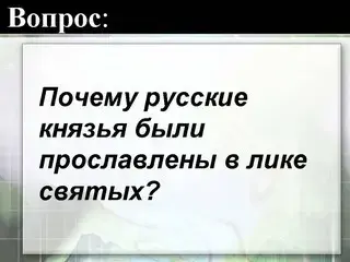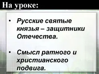 Образовательная и дидактическая задача: дать знания о русских святых князьях - защитниках Отечества, углубить понимание смысла христианского подвига, раскрыть понятие подвига ратного.