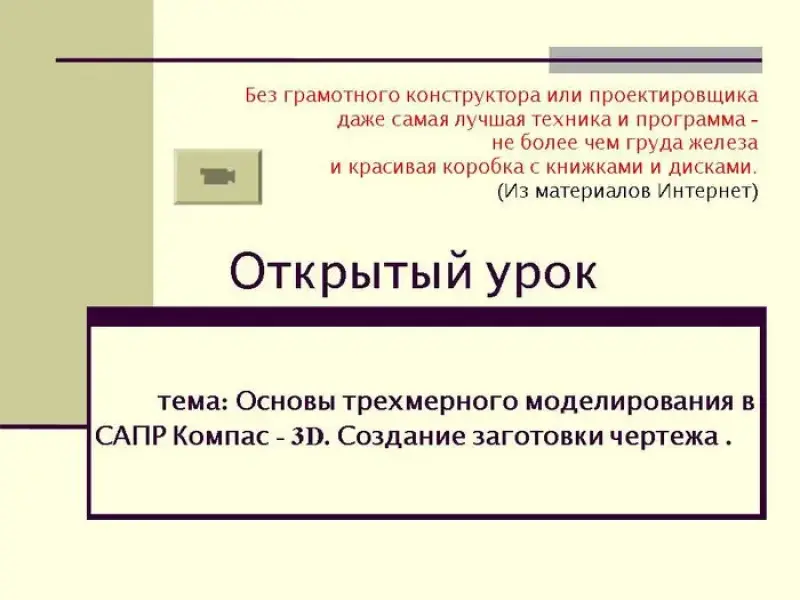 Хочу представить план одного занятия по изучению трёхмерного моделирования в САПР Компас-3D. При проведении урока используется презентация (ПРЕЗЕНТАЦИЯ). Продолжительность занятия - 1 пара (два урока)