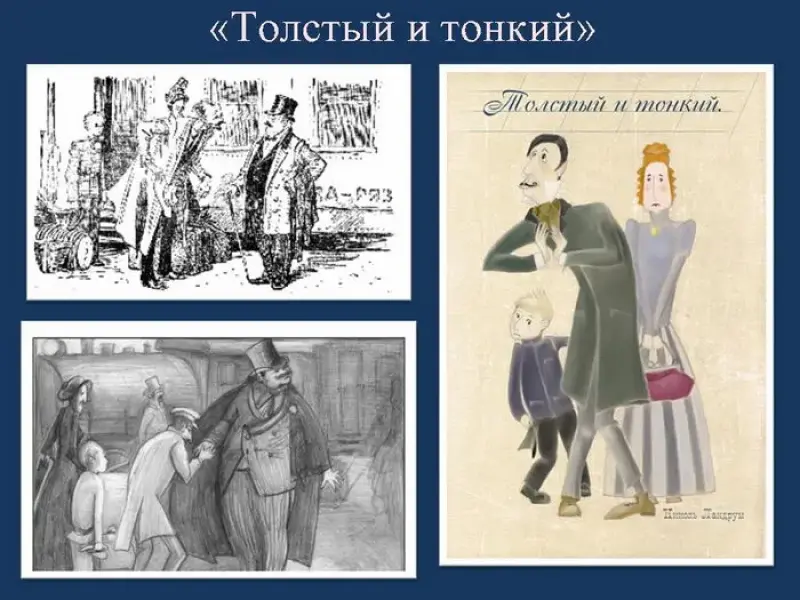 Шведов И. Сатирические рассказы А.П.Чехова беспощадно высмеивают чинопочитание, лакейство, приспособленчество, утрату чувства собственного достоинства. В рассказе "Толстый и тонкий" главный объект осмеяния - маленький чиновник, который подличает и пресмыкается, когда его никто к этому не вынуждает. Как- то Чехов сказал, что именно жанр короткого рассказа позволил ему создать мозаичную картину современного мира.