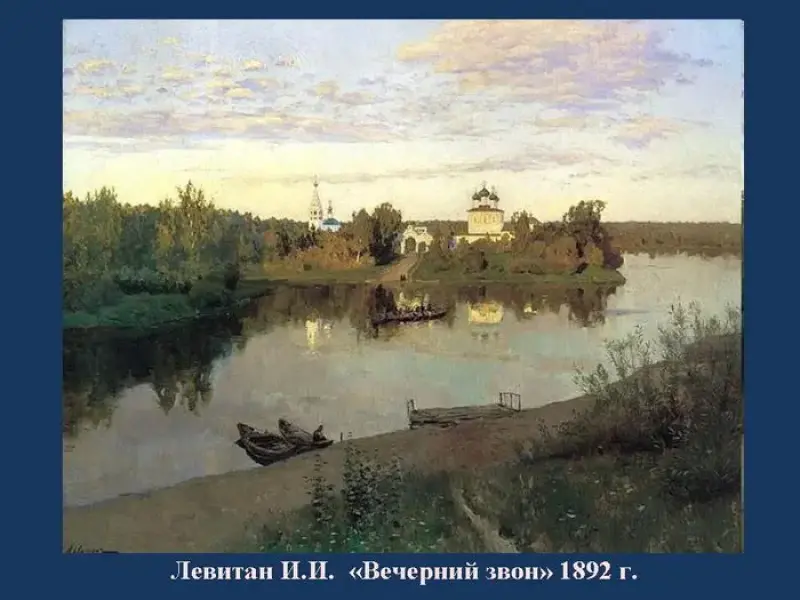 Осетрова В. "Белое облачное небо, прибрежные деревья, камыши и лодки с людьми и веслами отражались в воде, как в зеркале; под лодками, глубоко в глубине, в бездонной пропасти тоже было небо.: Один берег, на котором стояла усадьба, был высок, крут и покрыт деревьями, на другом, отлогом, зеленели широкие заливные луга и блестели заливы" (" Именины"; картина Левитана "Вечерний звон")