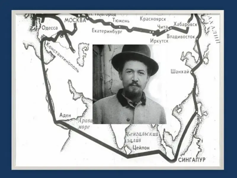 Моисеева А.(Карта поездки на Сахалин.) В жизни Чехова был загадочный год: год его путешествия на Сахалин. И в 30 лет он, преуспевающий писатель, благополучный врач, неожиданно для всех, через всю Россию едет к Тихому океану на остров Сахалин. В своем письме к А.С. Суворину он писал: "Мне страстно хочется спрятаться куда-нибудь лет на пять и занять себя кропотливым, серьезным трудом".