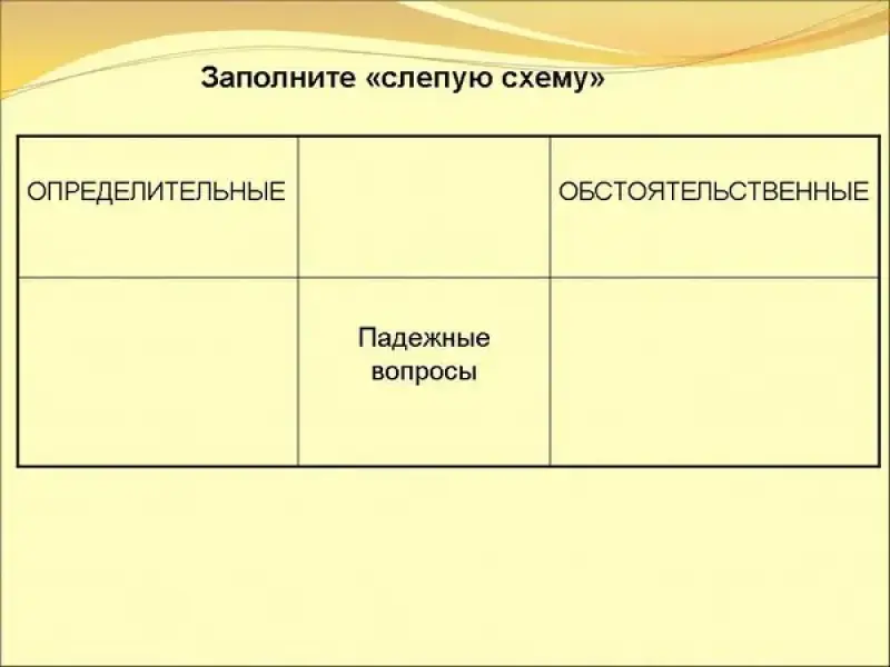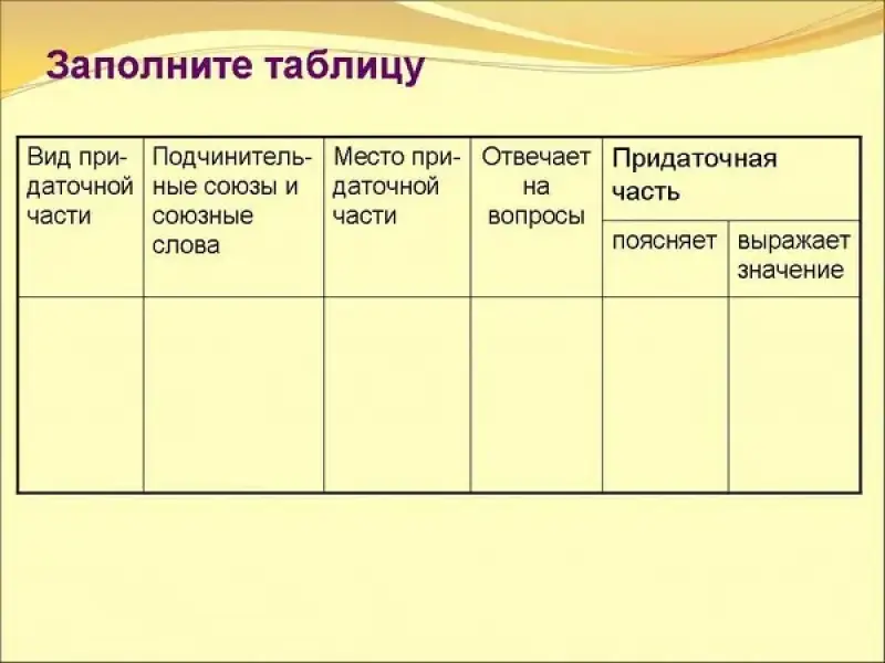 | Вид прид. части | Подчин. союзы и союзные слова | Указ. слово при пояс. слове | Место прид. части | Отвечает на вопросы | Прид. часть | |