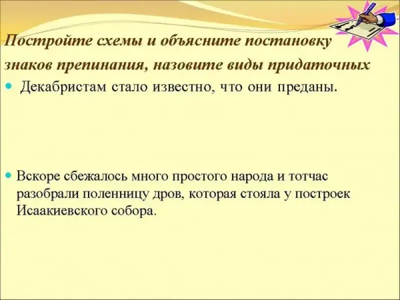 Задание 2. Постройте схемы и объясните постановку знаков препинания, назовите виды придаточных (В качестве проверки домашнего задания) (Слайд 6-8)