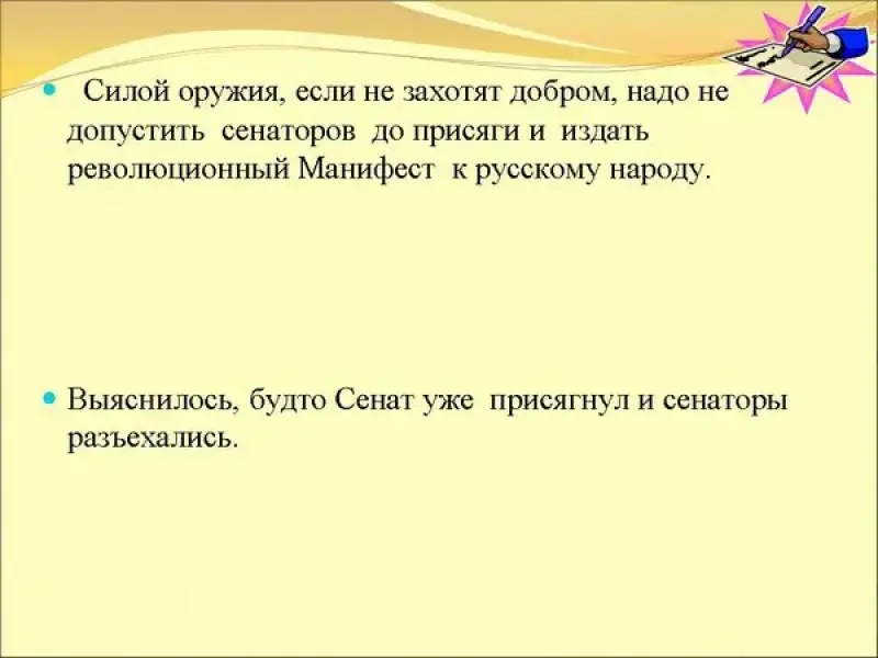 3) Силой оружия, если не захотят добром, надо не допустить сенаторов до присяги и издать революционный Манифест к русскому народу. [ … , ( если…), … ].