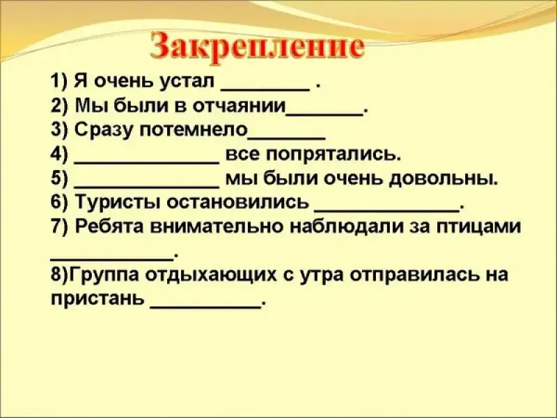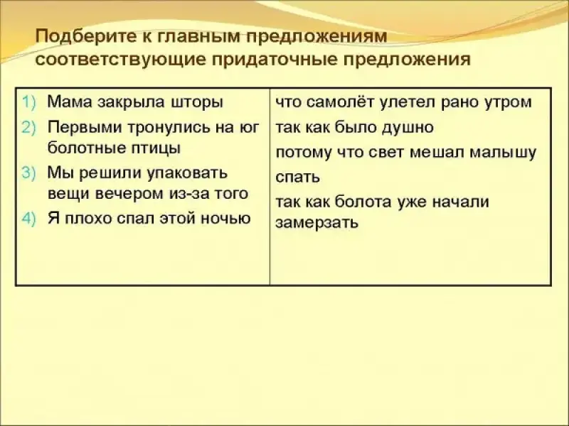 2) Первыми тронулись на юг болотные птицы 3) Мы решили упаковать вещи вечером из-за того 4) Я плохо спал этой ночью |