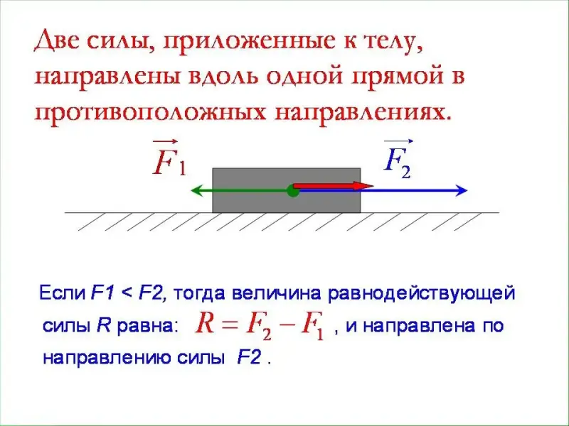 Если F1 и F2 направлены в противоположные стороны, то R = F1-F2, если F1>F2 и R = F2-F1, если F2>F1. (Слайд 10 и 11)