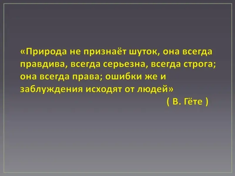 Эпиграф: "Природа не признаёт шуток, она всегда правдива, всегда серьезна, всегда строга; она всегда права; ошибки же и заблуждения исходят от людей" (В. Гёте ).