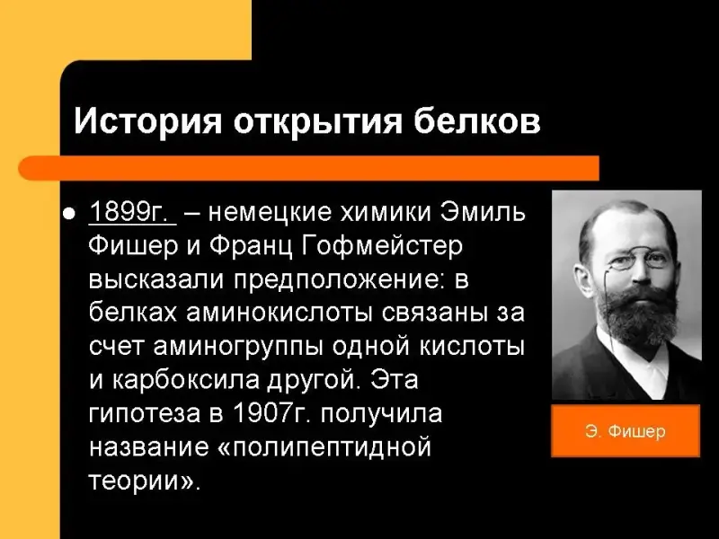 1899 г. - немецкие химики Эмиль Фишер и Франц Гофмейстер высказали предположение: в белках аминокислоты связаны за счет аминогруппы одной кислоты и карбоксила другой. Эта гипотеза в 1907г. получила название "полипептидной теории".