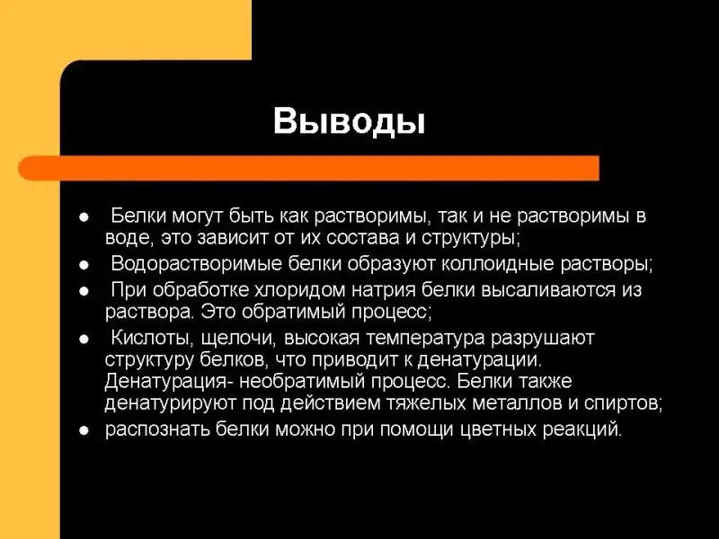 - белки могут быть как растворимы, так и не растворимы в воде, это зависит от их состава и структуры;