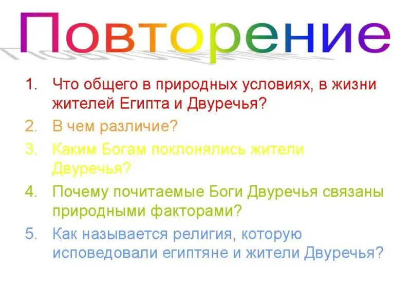 Реки Тигр и Евфрат берут начало с гор Закавказья и стекают в Персидский залив, текут с севера на юг. (современные государства, по которым протекают реки - Турция, Сирия и Ирак) Государства Двуречья возникли более 5 тысяч лет назад Язычество-основная религия жителей Двуречья Хозяйство-натуральное. Выращивали пшеницу, ячмень, просо, сезам, финики. Занятие-строительство каналов, земледелие, мелкое ремесло Письменность-клинопись, клинообразные значки на мокрой глине.
