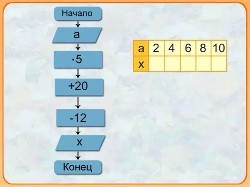 Он поможет нам открыть ключевое слово и сформулировать тему урока. Перед вами блок-схема. На табличках Блок-схемы записаны команды (действия). Стрелки показывают в какой последовательности их (эти команды) надо выполнять. Это алгоритм. Вначале алгоритма дана переменная а, рядом в таблице даны значения а. Вместо переменной вы подставляете её значение, пошагово объясняете свои действия в алгоритме. Полученный результат запишем в таблицу и откроем одну букву ключевого слова. Используйте для ответа математическое табло. Набирайте на нём нужное число. Показывайте ответ.