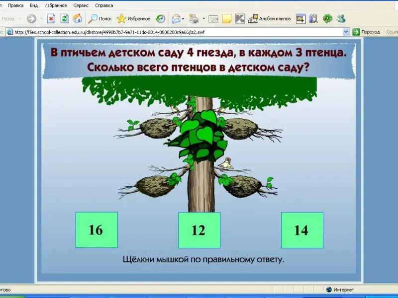 - Повторите вопрос задачи. Кто знает решение? Запишите решение самостоятельно. Проверим, кто составил такое же выражение? Чему равно значение выражения? Покажите на табло. А можно было записать 4х3? Почему нет? (Какое число повторяется? Сколько раз оно повторяется? Сколько раз по 3 взяли? Как найти общее количество птенцов?) Запишите ответ, проверим правильность решения по компьютеру. Если задачу решили правильно, то появится улыбающийся человечек.