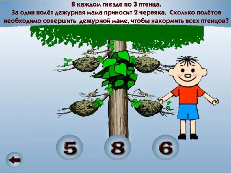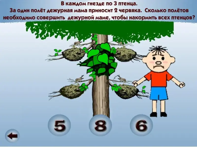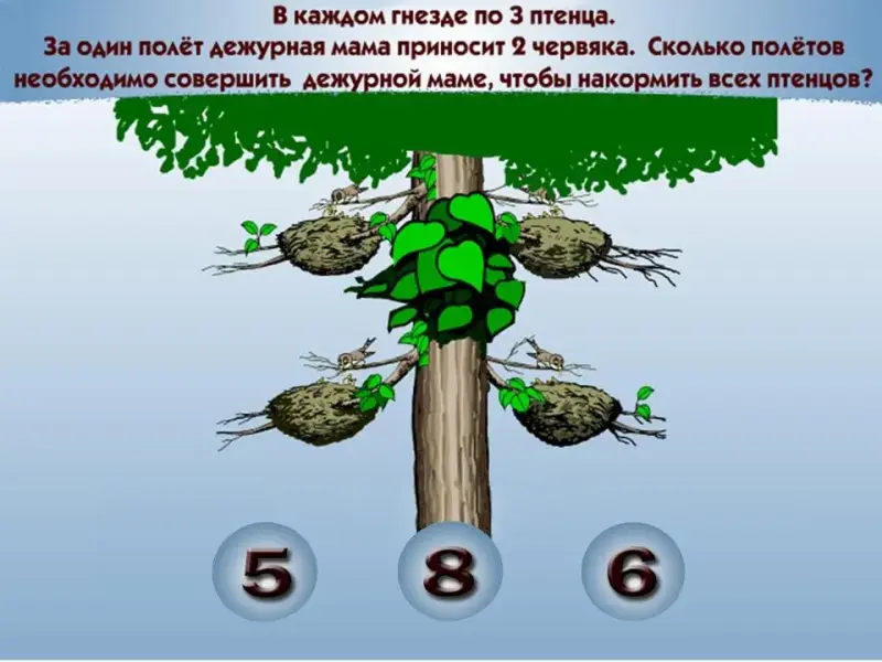 С решением предыдущей задачи вы справились легко, попробуем её усложнить, Внимание на экран, прочитайте новую задачу. "В каждом гнезде по 3 птенца. За один полёт дежурная мама приносит 2 червячка. Сколько полётов необходимо совершить дежурной маме, чтобы накормить всех птенцов?". (Слайд 5)