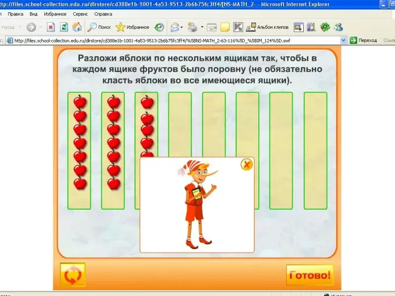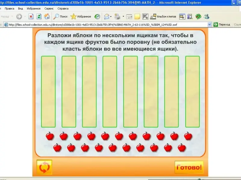 Разложи яблоки по нескольким ящикам так, чтобы в каждом ящике фруктов было поровну (не обязательно класть яблоки во все имеющиеся ящики).