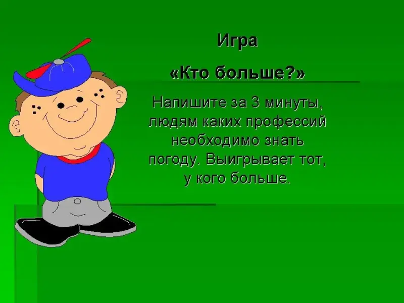 Игра "Кто больше?" Слайд 18. Презентация. Погода имеет огромное значение для жизни на Земле. Напишите, люди каких профессий используют данные прогноза погоды? (3 мин) Выигрывает тот, у кого больше (фронтальный опрос)