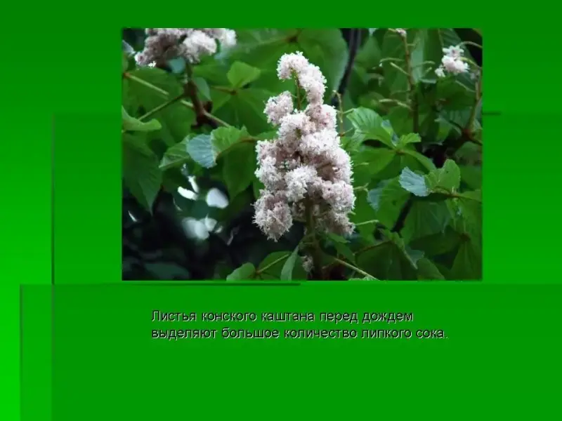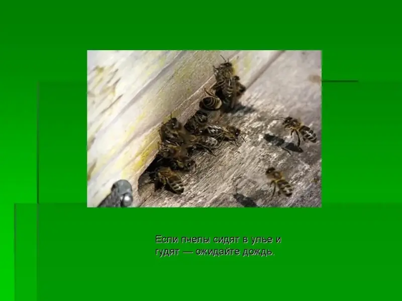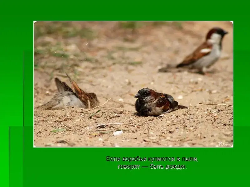 - Если воробьи купаются в пыли, говорят - быть дождю. Муравьи и пауки усиленно работают - быть хорошей погоде и теплу. Но если пчелы сидят в улье и гудят - ожидайте дождь. Если петухи поют рано с вечера, - к потеплению. Листья конского каштана перед дождем выделяют большое количество липкого сока.