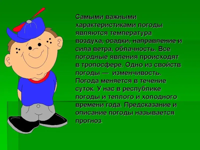 Карточка. Самыми важными характеристиками погоды являются температура почвы и воды в реке, море, океане. Все погодные явления происходят в стратосфере. Одно из свойств погоды - постоянство. Погода меняется только в течение года. Главная причина перемен в любое время суток в погоде - перемещение воздушных масс. У нас в республике в течение всего года преобладают погоды теплого времени года. А предсказание погоды называется - гороскоп.