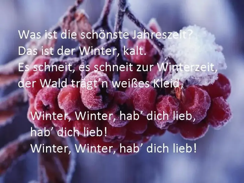 1. Рифмовка.а) Sprechgymnastik. Hört zu und singt! Unseres Lied heißt "Das Jahr". Dieses Lied haben wir im 4. Klassen gesungen. (Дети поют под сопровождение аудиозаписи к учебнику, на экране текст песни - слайды 2- 6)