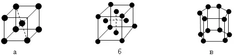 Рассказывая о строении кристаллов, говорим, что расположение частиц в пространстве может быть различным, но не любым. Для размещения частиц в кристаллах характерно наличие симметрии по отношению к определенным плоскостям и направлениям. Число различных возможных элементов и типов симметрии также ограничено. Изучение внутреннего строения кристаллов позволило установить, что частицы в кристаллах (молекулы, атомы и ионы) имеют правильное расположение, т.е. образуют кристаллическую (пространственную) решетку. Точки в кристаллической решетке, соответствующие наиболее устойчивому положению равновесия частиц твердого тела, называются узлами решетки. Наиболее простые способы расположениячастиц, составляющих кристаллы: кубические и гексагональные пространственные решетки (рис. 6), а также решетки алмаза и графита. Кубические решетки бывают объемно-центрированные (рис. 6.а) где частицы расположены в вершинах и центрах кубов; гранецентрированные (рис. 6.б), где частицы расположены в вершинах и центрах граней кубов.