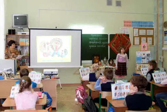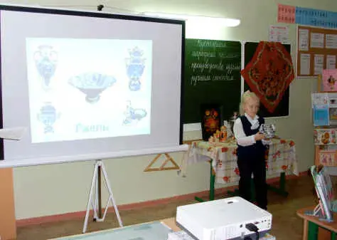 /Учитель произносит вступительное слово и демонстрирует поочерёдно кадры презентации на экране с помощью проектора, подготовленные учащиеся выходят и делают небольшой доклад о народном промысле, изображённом на экране.