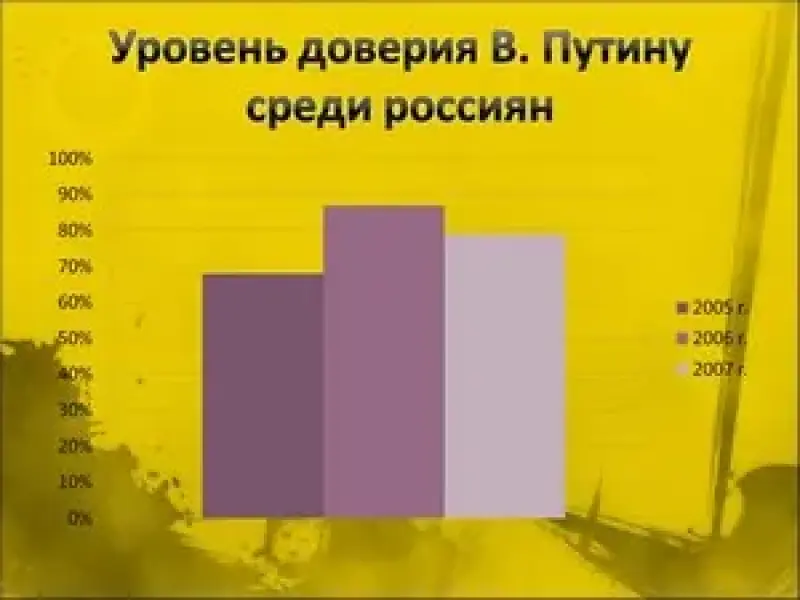 С 1999 г. Владимир Владимирович Путин является самым популярным политиком в России. По данным социологических опросов, число россиян, поддерживающих Президента Путина, выросло с 14% в 1999 г. до 79% в 2007 г. Данные ВЦИОМ говорят, что в 2005 г. деятельность В. Путина одобряли 68% населения, а в 2006 - 87%. По данным Левада-Центра, уровень одобрения деятельности политики В. Путина на посту Президента в 2007-2008 гг. колебался в пределах 79-87% жителей России. Не одобряли деятельность В.В. Путина от 12 до 19 % населения России.