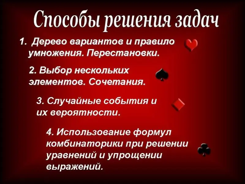 - показать различные способы решения задач по комбинаторике, не используя алгебраические выкладки;