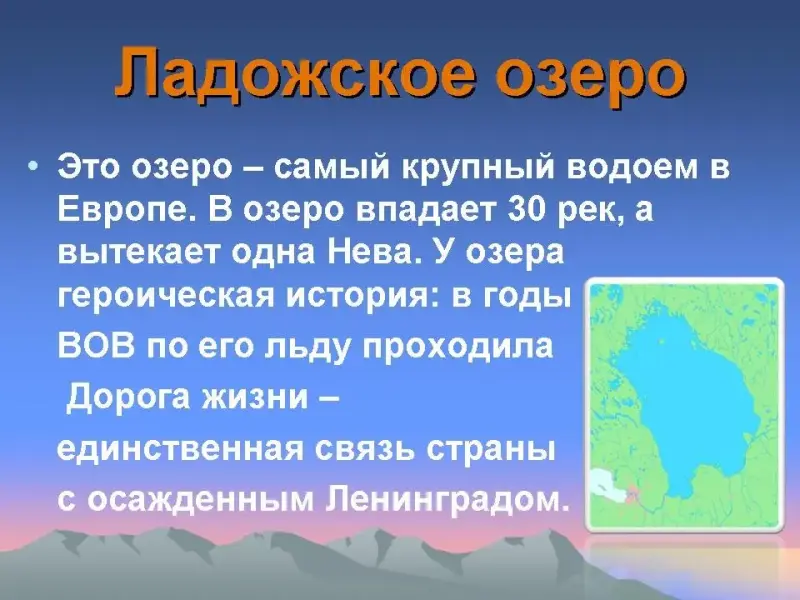 - Это озеро - самый крупный водоем в Европе. В озеро впадает 30 рек, а вытекает одна Нева. У озера героическая история: в годы ВОВ по его льду проходила Дорога жизни - единственная связь страны с осажденным Ленинградом. (Ладожское)