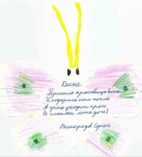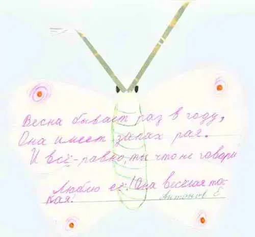 В классе учитель повесил конверт, в который дети клали написанные самостоятельно стихотворения. По желанию учителя, можно стихотворения редактировать совместно с автором. Наиболее удачные оставлять без изменений. После этой работы стихотворения были переписаны на вырезанных разукрашенных бабочках.