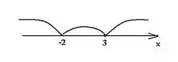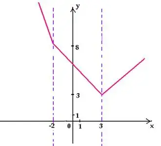 Подобно тому, как числовая прямая точками - 2 и 3 разбивается на промежутки, координатная плоскость прямыми х = - 2 и х = 3 разбивается на части («полосы»), в каждой из которых строим свой график. Заметим, что данная функция непрерывна, поэтому на «границах» части графика должны соединяться.