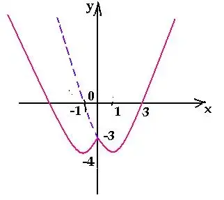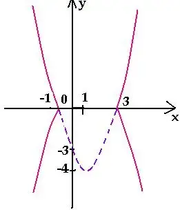 Построим сначала график функции у = х2 - 2х - 3. Графиком этой функции является парабола, ветви которой направлены вверх. Координаты ее вершины: х = 1, у = - 4. Точки пересечения параболы с осями координат: (0; - 3); (- 1; 0); (3; 0). Далее выполняем отображение части графика, лежащей в нижней полуплоскости, относительно оси абсцисс.